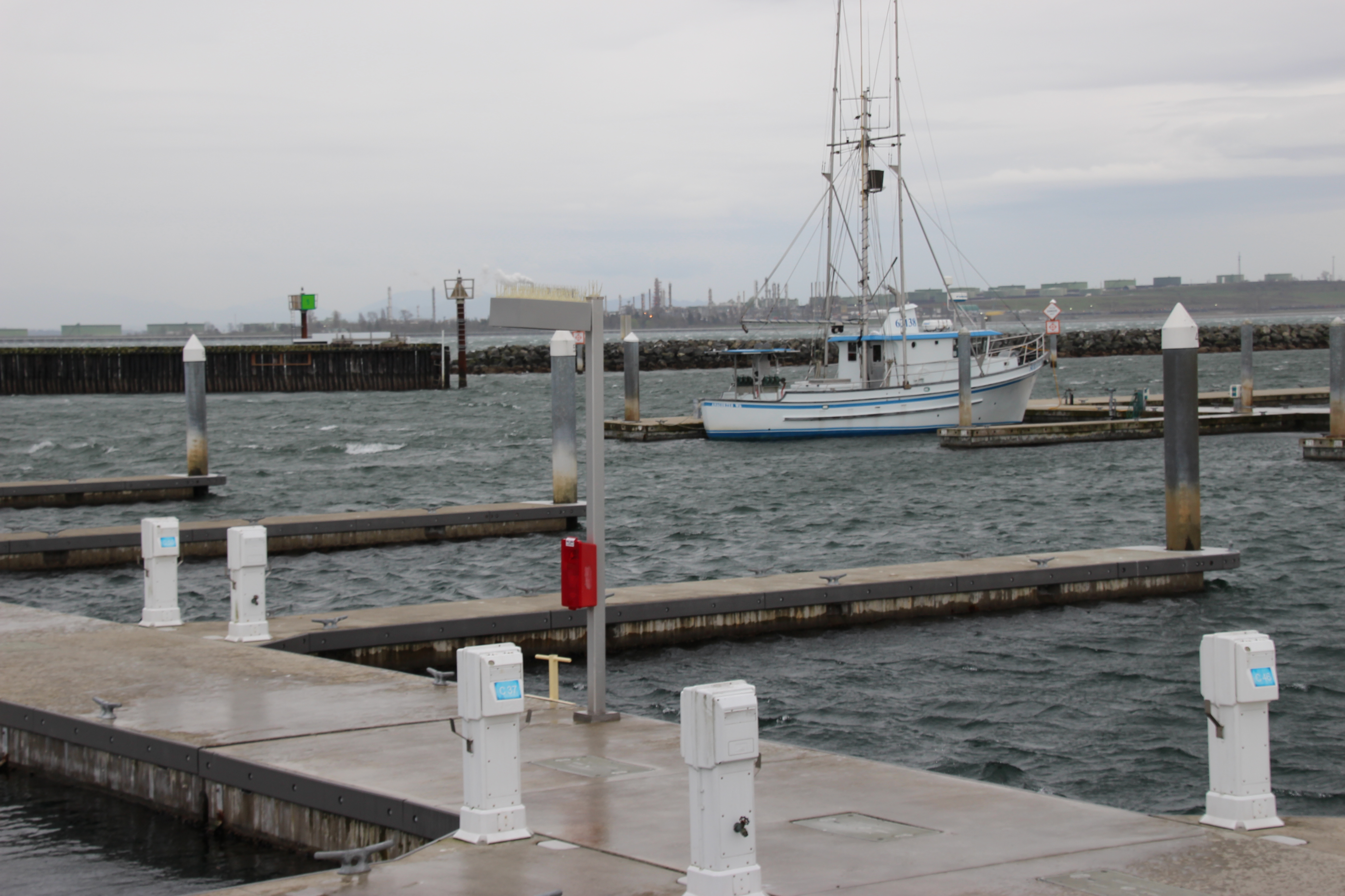 Below are a couple of pictures of the marina with winds blowing 40-50 mph. The marina should not have white caps. Also we are there almost my ourselves. Boating season doesn’t start until May 1, so guest docks are open.